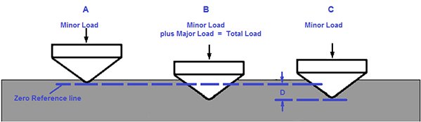 Rockwell sertlik deneyi, sabit yük altında, malzeme üzerinde oluşturulan iz derinliğinin ölçülmesi esasına dayanır. Ölçümü yapılacak malzemenin cinsine göre, iz bırakıcı olarak ucu çok az yuvarlatılmıs 120º ‘lik konik elmas uç veya 1/16″ ve 1/8″ çapında çelik bilyalar kullanılır. Yük ise 60, 100 veya 150 kg olarak uygulanır.